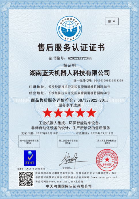 實(shí)力“五星”, 服務(wù)“五星”!湖南藍(lán)天機(jī)器人通過商品售后服務(wù)評價(jià)體系五星級認(rèn)證